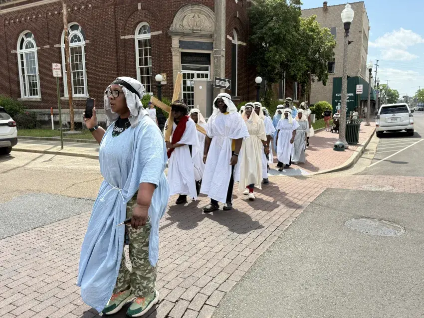 Amanda Elzy High School teacher and instructional coach Areka Watkins, in front, organized a crucifixion-themed walk in downtown Greenwood Friday with Elzy 11th graders. The students walked down Howard Street and then crossed Keesler Bridge. Gospel music played throughout with pauses for students to read Scripture. After the walk, the students participated in an Easter egg hunt. (By Taylor Thompson, Copyright 2025 Emmerich Newspapers, Inc.)