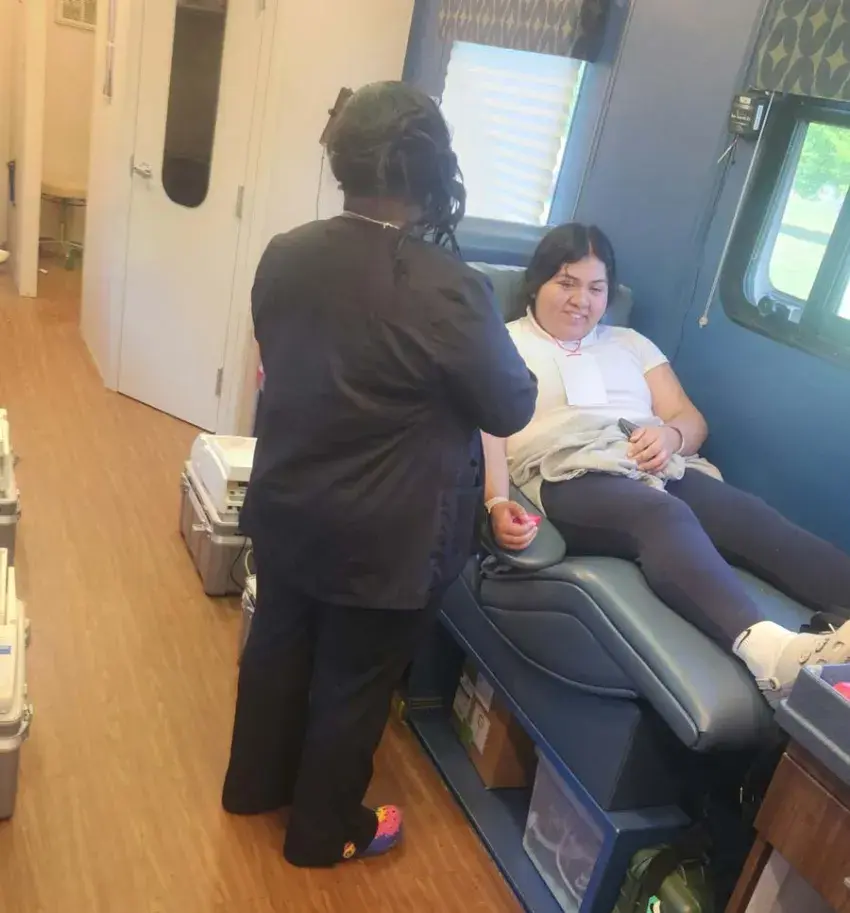 Adriana Maldonado gives blood Wednesday during a blood drive at Amanda Elzy High School conducted by Mississippi Blood Services of Cleveland. At left is phlebotomist Shelia Chandler. Mississippi Blood Services will be at Leflore County High School from 9 a.m. to 2 p.m. Thursday and at Greenwood Leflore Hospital from 1 to 6 p.m. Friday. The drives are open to the public. (By Roishina C. Henderson, Copyright 2025 Emmerich Newspapers, Inc.)