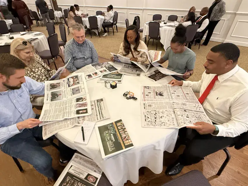 The Rev. Collin Montgomery of First Baptist Church, left, looks over the “Top 30 Under 40” special section of The Greenwood Commonwealth along with his parents, Sheryl and Dennis Montgomery, and MoIeshia Johnson, Alexandria Wilcher and Kamron Daniels, a self-employed engineer, chef and caterer. Johnson and Wilcher are friends of Daniels. The group attended the Top 30 Under 40 luncheon Friday at the Greenwood Country Club, where Montgomery and Daniels were among the 30 individuals under the age of 40 who were honored for their professional and civic achievements. (By Taylor Thompson, Copyright 2025 Emmerich Newspapers, Inc.)