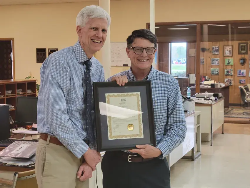 Wyatt Emmerich, right, gifts a commemorative plaque from the Mississippi Press Association to Tim Kalich, the retiring editor and publisher of the Commonwealth, on Friday during a party organized by the newspaper’s staff in Kalich’s honor. Emmerich, president of Emmerich Newspapers, the Commonwealth’s parent company, described Kalich as a brother. Kalich first came to the Commonwealth in 1982 as a reporter after being hired by Emmerich’s father, the late John O. Emmerich Jr. Friday was Kalich’s last day at the Commonwealth. (By Kevin Edwards, Copyright 2025 Emmerich Newspapers, Inc.)