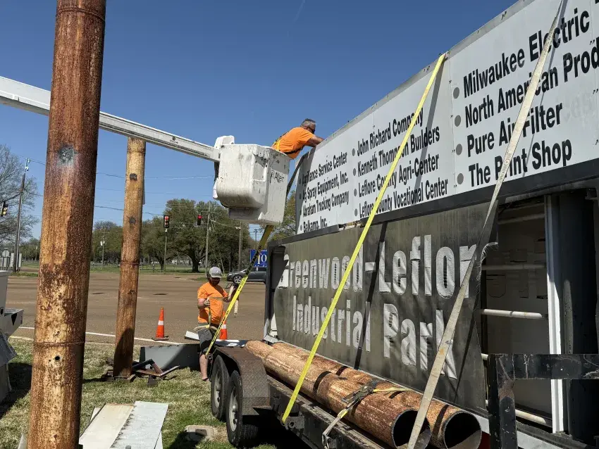 Workers for Mitchell Signs of Meridian — Gary Alexander in the bucket truck, and Matthew Lenning — get ready Tuesday to haul off the sign at the intersection of U.S. 82 and Sycamore Avenue that points to the Greenwood-Leflore Industrial Park. Over the next 60 days, a new elevated sign, mounted on a brick base and illuminated internally, will be installed at that spot, said Thomas Gregory, executive director of the Greenwood-Leflore-Carroll Industrial Foundation. (By Tim Kalich, Copyright 2025 Emmerich Newspapers, Inc.)