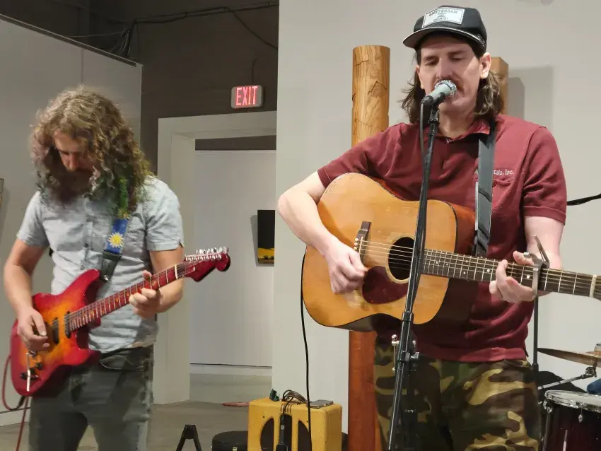 The Hush Puppy Music Co-op held its first show at the Museum of the Mississippi Delta Thursday night featuring Electric Blue Yonder from Montgomery, Alabama, and BB Palmer from Mobile, Alabama. From left, Electric Blue Yonder’s Johnny Veras plays alongside Palmer. (By Kevin Edwards, Copyright 2025 Emmerich Newspapers, Inc.)