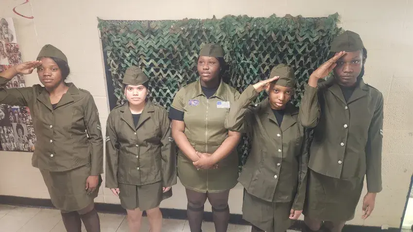 Amanda Elzy High School held a live wax museum on Friday for Black History Month. The theme was “We Are Black History.” About 35 students were dressed as inventors, physicians, famous musicians and other figures. Above: Portraying the 6888th Central Postal Directory Battalion, which worked to clear a huge backlog of mail during World War II, are, from left, 11th graders Kyriunna Collins, Marysol Zuniga, Collindria Crigler, Kiara Howard and Tatianna Hardrick. (By Roishina C. Henderson, Copyright 2025 Emmerich Newspapers, Inc.)