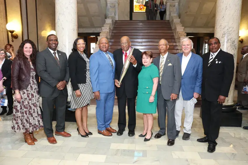 State Sen. David L. Jordan, D-Greenwood, was honored Thursday with the presentation of an Official 2024 Olympic Torch, “in honor of the many years of service Senator Jordan has given to the State of Mississippi.” State Sen. Lydia Chassaniol, R-Winona, presented a resolution in his honor. From left are Clark Beverage Group Vice President Morgan Clark Schnur, Leflore County Circuit Clerk Johnny Gary Jr., Leflore County Administrator Cynthia Stanciel, Greenwood City Council President Ronnie Stevenson, Jordan, Greenwood Mayor Carolyn McAdams, Ward 7 City Councilman Carl Palmer, Ward 1’s Johnny Jennings and Ward 4’s Charles McCoy. (By Andy Lo, Copyright 2025 Emmerich Newspapers, Inc.)