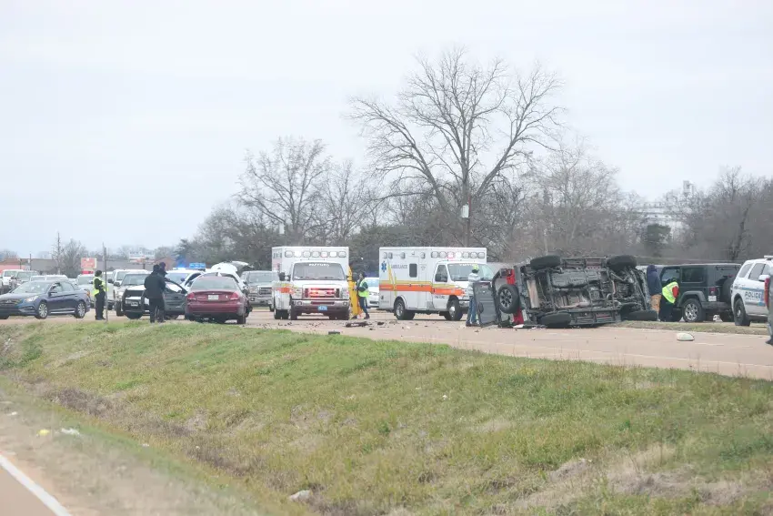 A two-vehicle collision ocurred around 3 p.m. Tuesday in the eastbound lane on U.S. 82 near the intersection with Linden Avenue. A maroon sedan crashed with a red Jeep. Two people, one from each vehicle, were transported from the scene in ambulances. (By Andy Lo, Copyright 2025 Emmerich Newspapers, Inc.)