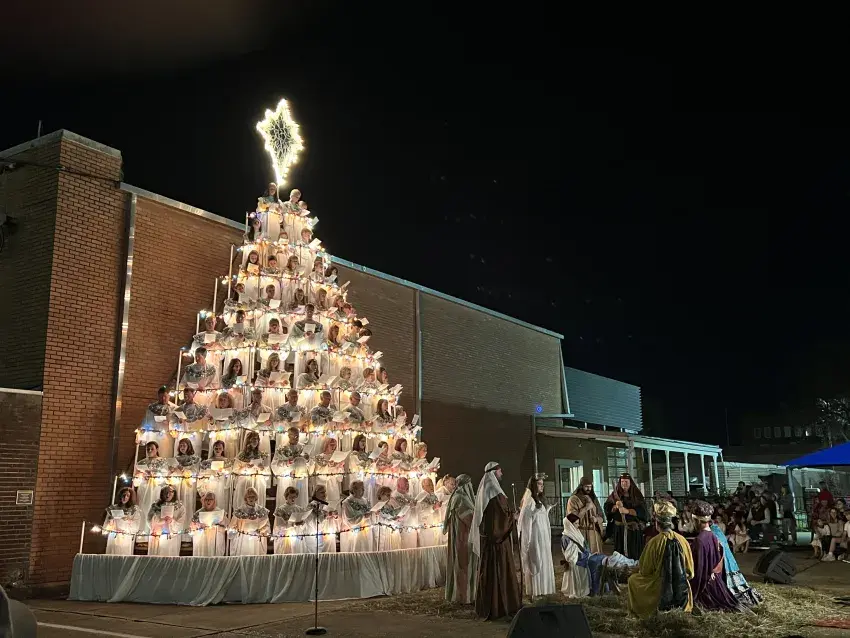 First Presbyterian Church presented its 43rd annual Singing Christmas Tree on Monday. The tree featured 1,500 lights and held about 100 singers. This year’s presentation was titled “Let There Be Peace on Earth.” (By Taylor Thompson, Copyright 2024 Emmerich Newspapers, Inc.)