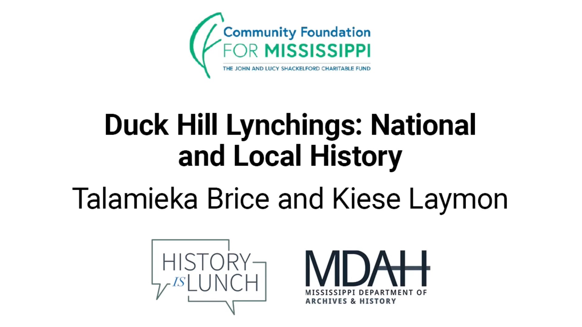 On February 9, 2022, Talamieka Brice and Kiese Laymon presented “Duck Hill Lynchings: Local and National History" as part of the History Is Lunch series.